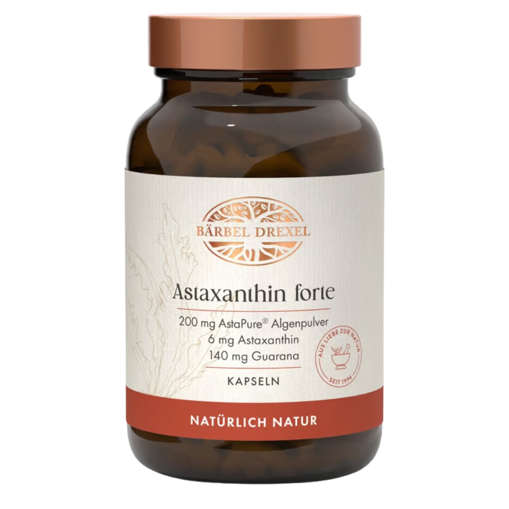Die Astaxanthin forte Kapseln von Bärbel Drexel sind der Goldstandard unter den Astaxanthin-Präparaten. Sie vereinen jahrzehntelange Expertise im Bereich der Algen mit modernster Bioverfügbarkeitstechnologie. Die einzigartige Kombination aus Pulver und Extrakt enthält 6 mg hochwirksames Astaxanthin und ist mit energieförderndem Vitamin B6 sowie Guarana-Extrakt angereichert. Damit hebt sich das Produkt von den üblichen reinen Extraktformulierungen ab.